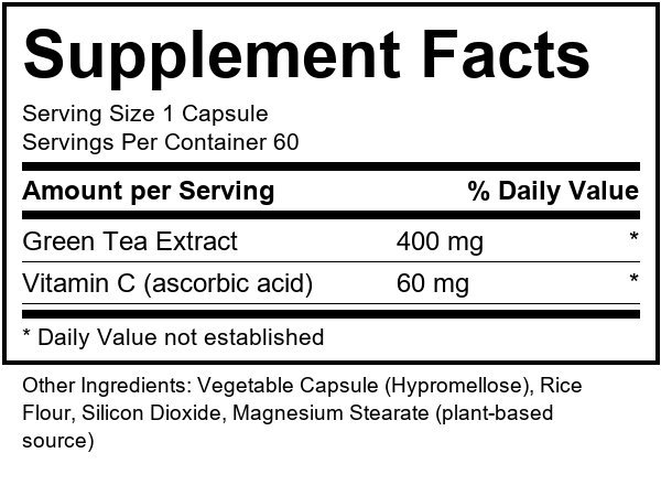 A: The product contains green tea extract and vitamin C, along with standard excipients.