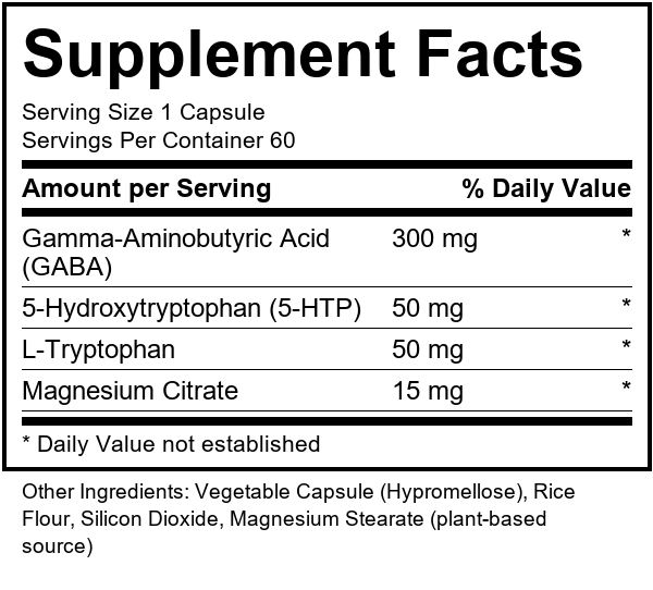 A: A dietary supplement containing GABA, 5-HTP, L-Tryptophan, and magnesium citrate in a single formulation.